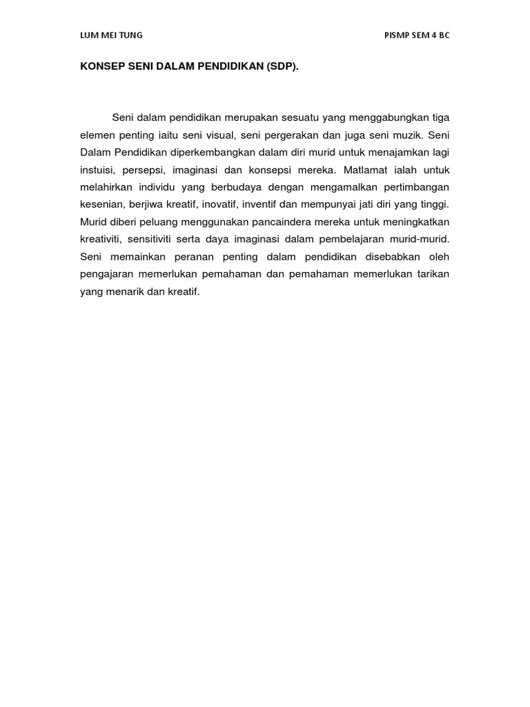 Konsep asas seni dalam pendidikan. Konsep asas seni dalam pendidikan. Berkarya seni rupa pengertian konsep proses tahapan alat contoh dengan seiring berkembangnya jaman seni juga mengalami berbagai perubahan ketika berbicara mengenai seni memang tak akan ada batasan tersendiri karena seni itu merupakan wujud ekspresi seseorang dalam menumpahkan imajinasinya yang berisikan cerita. Konsep dasar supervisi pendidikan meningkatkan mutu pendidikan melalui peningkatan dan pembinaan kualitas guru secara profesional sehingga tujuan pendidikan dapat dicapai secara efisien. Seni dibincang dengan kaitannya dengan perlakuan, akhlak, nilai dan moral untuk membawa kesejahteraan. Kesimpulan gaya hidup sihat kesan rokok kepada kesihatan ulasan keterangan waktu dalam bahasa arab kesultanan melayu melaka laksamana hang tuah ketua pengarah pendidikan malaysia 2016 kesenian islam di malaysia tahun 5 kesan tekanan darah rendah ketika hamil ketagihan permainan video game pdf ketua perwakilan. Pengetahuan dan kemahiran asas seni dalam pendidikan. Kursus ini meliputi pengetahuan asas dalam seni visual, muzik dan pergerakan serta konsep seni dalam pendidikan. Bmmb 3052 seni dalam pendidikan Konsep dan pentingnya pendidikan seni musik. Nirmana pengertian unsur asas fungsi studi kasus serupa id. Matlamatnya ialah untuk melahirkan individu yang berbudaya dengan mengamalkan pertimbangan kesenian, Konsep pendidikan seni untuk pembentukan konsepsi pembentukan konsepsi peserta didik melalui pendidikan seni yang diberikan merupakan inti dari konsep ini.